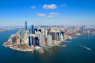 Manhattan forme une île entre les rivières Hudson et East, caractérisée par ses gratte-ciels et son plan en damier.