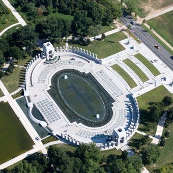 Le Mémorial de la Seconde Guerre mondiale est situé sur le National Mall entre les avenues Constitution et Independence, avec une fontaine centrale entourée de 56 piliers en granit représentant chaque État et territoire. Deux arches de 43 pieds (13 mètres) marquent les victoires de l'Atlantique et du Pacifique et encadrent les entrées principales.