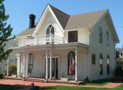 La maison blanche en bois de style néogothique surplombe la rivière Missouri, comprenant deux étages et des détails architecturaux d'époque.