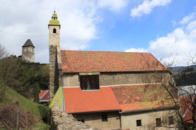 L'Heiligblutkirche est un bâtiment d'église à Friesach surmonté d'un clocher élancé avec un dôme en oignon sur le côté ouest. La structure est renforcée par des contreforts et présente une section de choeur polygonale typique des églises monastiques médiévales.