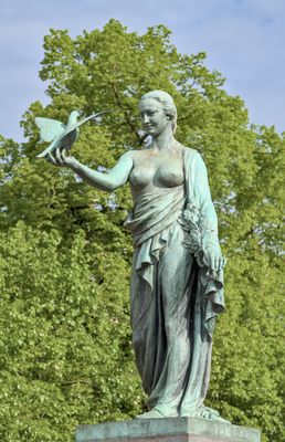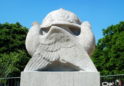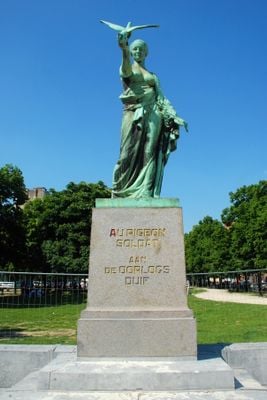 Le Monument au Pigeon-Soldat présente une statue centrale en bronze représentant une figure tenant un pigeon et une palme sur un piédestal en pierre.