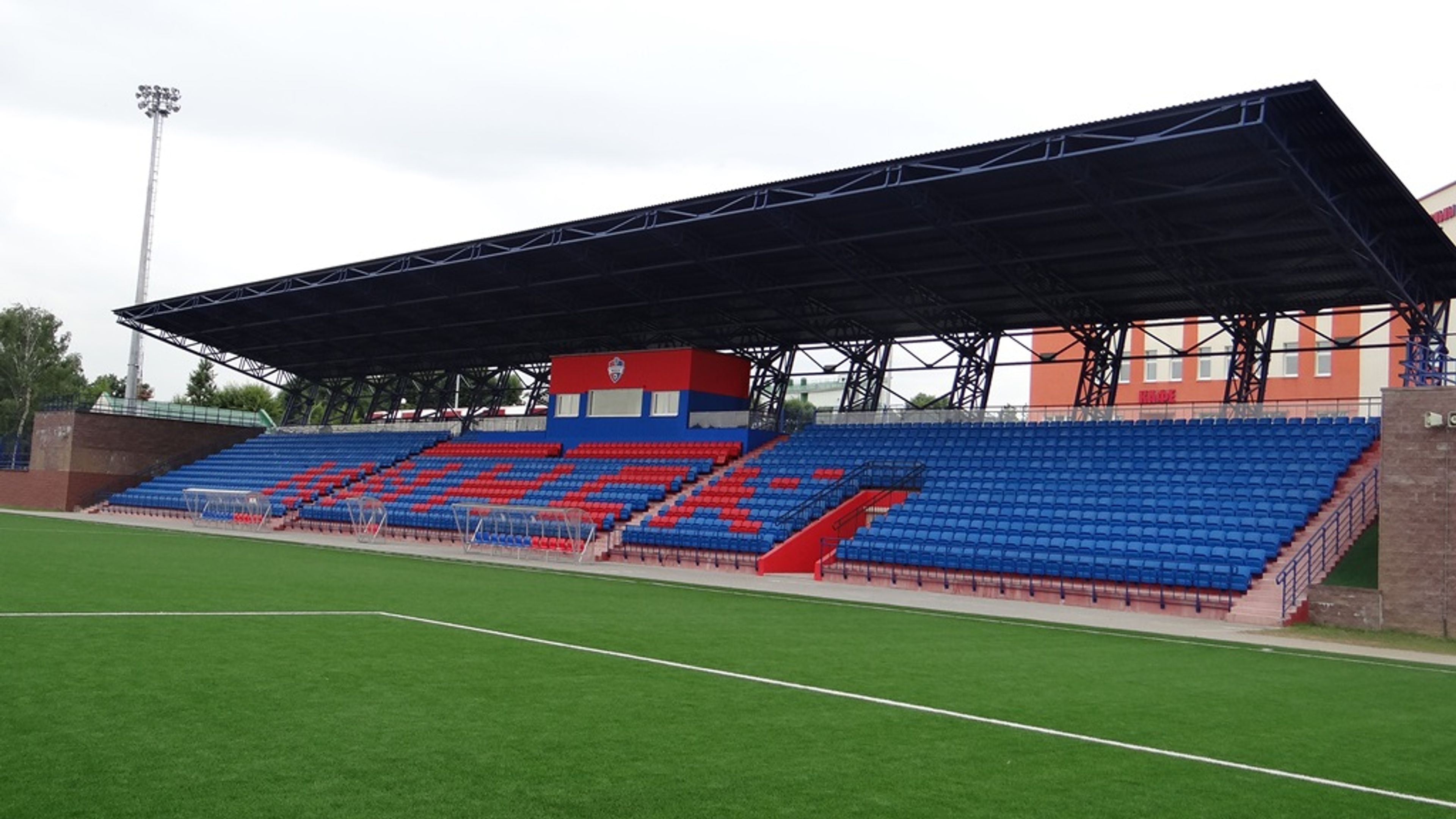 Le Stade FC Minsk présente un terrain principal en gazon entouré de sections de sièges rouges et bleus pouvant accueillir trois mille spectateurs.