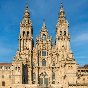 La cathédrale métropolitaine-basilique de saint Jacques-Apôtre est une église catholique à Saint-Jacques-de-Compostelle, en Espagne, construite en pierre grise avec des éléments romans et baroques. Son plan suit une croix latine avec trois nefs s'étendant sur 100 mètres de long et 70 mètres de large.
