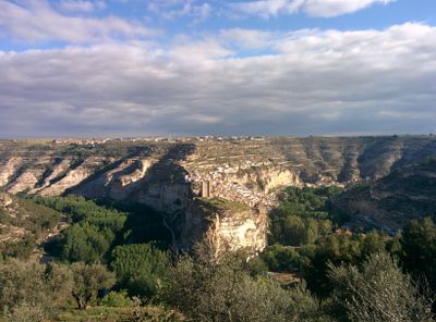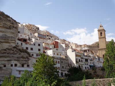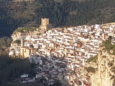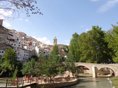 Alcalá del Júcar est un établissement dans la région de Manchuela qui s'accroche aux falaises de calcaire au-dessus du fleuve Júcar. Les maisons blanches sont construites directement dans la roche à environ 596 mètres d'altitude, suivant les contours naturels de la gorge.