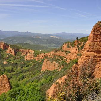 Las Médulas est une ancienne zone d'exploitation minière à ciel ouvert dans les montagnes de León au nord-ouest de l'Espagne, désormais protégée comme réserve naturelle et site archéologique. Le paysage montre des formations d'argile rouge avec des pics, des grottes et des vallées profondes, entourées de forêts de châtaigniers et de points d'observation dispersés.