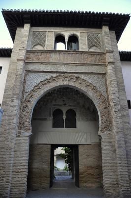 L'entrée affiche des inscriptions arabes et des motifs géométriques qui reflètent le savoir-faire des artisans nasrides. Ces ornements montrent comment les voyageurs rencontraient des expressions artistiques raffinées dans leurs espaces quotidiens.