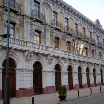 Casa del Piñón est un immeuble d'angle de style Moderniste sur la rue Mayor présentant trois niveaux reliés par des arcs semi-circulaires, des balustrades continues et des rampes en métal. L'arrangement en forme de L crée une présence distinctive à l'intersection avec des fenêtres et des ouvertures soigneusement proportionnées.