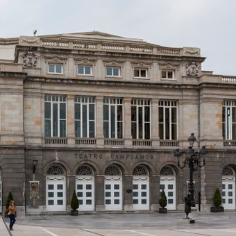 Le Théâtre Campoamor présente une architecture néoclassique avec une façade monumentale ornée de colonnes et de sculptures décoratives en pierre.