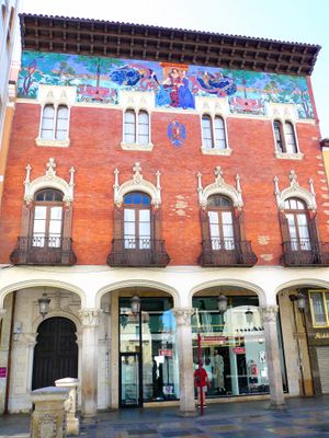 La façade mélange les styles gothique vénitien et moderniste catalan, reflétant la formation de l'architecte Jerónimo Arroyo à Barcelone.