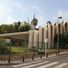 Le bâtiment éducatif présente un agencement en spirale autour d'un espace ouvert, avec des jardins extérieurs et plusieurs niveaux reliés par des escaliers.