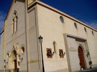 L'église néogothique se dresse rue Verónica, présentant des arcs pointus et des éléments verticaux caractéristiques de l'architecture ecclésiastique médiévale.