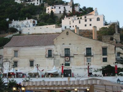 La façade présente des sgraffites préservés, des barres anciennes, des balcons, un cadran solaire et des niches dédiées à Saint Raymond et la Vierge Carmen.