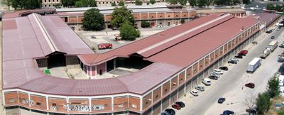 Le Mercado Central de Frutas y Verduras est un marché de gros à grande échelle situé près du fleuve Manzanares avec une structure triangulaire et une construction en béton moderne. Le bâtiment dispose de deux étages avec des verrières continues et des façades en brique conçues pour assurer la ventilation naturelle et l'éclairage.