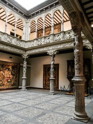 Le Patio de la Infanta est une cour Renaissance à Saragosse avec des travaux de pierre ornementée et des éléments décoratifs typiques du 16e siècle. La structure comprend un espace central ouvert avec des colonnes et des arcades, entouré de murs sur plusieurs étages créant une atmosphère fermée et intime.