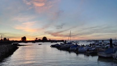 Les pêcheurs locaux conservent leurs pratiques traditionnelles le long de ce rivage, avec des bateaux et des filets visibles sur le sable. Cette activité quotidienne donne au lieu son caractère de côte vivante et active.