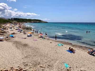 Playa Santo Tomás est une plage côtière du sud d'es Migjorn Gran avec une large bande de sable blanc et fin. La baie forme un croissant naturel encadré par des falaises rocheuses à chaque extrémité.