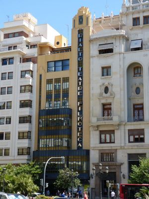 Le Cine Rialto est un theatre Art Deco sur la Plaza del Ayuntamiento a Valence avec une tour distinctive et une facade verticale dotee de grandes ouvertures vitrees sur six etages et sous-sol. Le batiment renferme un theatre principal, une salle de projection cinematographique, un espace de spectacle et une salle de musique au sous-sol.