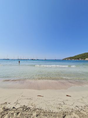 Platja de ses Salines est une plage de sable à Sant Josep de sa Talaia sur la côte sud d'Ibiza, caractérisée par du sable doré fin et une eau claire. Des forêts de pins bordent l'arrière-plan, avec des marais salants s'étendant au-delà.