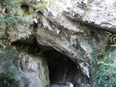 La grotte calcaire s'étend sur plus de 300 mètres, comprenant une route et un ruisseau qui coule à travers son intérieur caverneux.