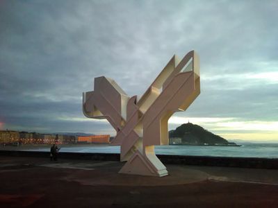 La Colombe de la Paix présente un oiseau métallique aux ailes déployées mesurant 9 mètres de large et 7 mètres de haut face à la mer Cantabrique.