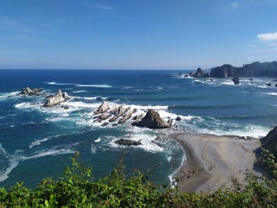 La plage de Gueirúa s'étend sur 135 mètres le long de la côte asturienne, présentant des galets et des rochers contre des falaises et formations rocheuses.