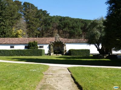 Le Pazo de Santa Cruz de Ribadulla est un manoir baroque situé en Galice, entouré de vastes terrains aux plantations variées. La propriété comprend plusieurs zones de jardin, des chemins reliant différentes sections, et des bosquets d'arbres matures dispersés dans le paysage.