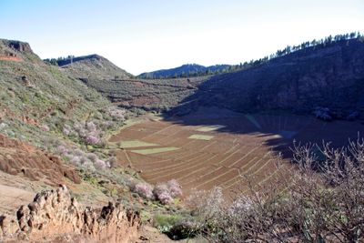 Le fond de la caldeira montre des motifs geometriques resultant de siecles d'agriculture locale. Ces champs cultives a la main offrent un apercu des methodes traditionelles de culture aux Iles Canaries.