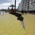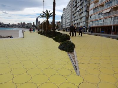 La promenade en béton blanc s'étend le long de la plage Poniente avec des formes courbes, plusieurs niveaux et des carreaux de céramique colorés.