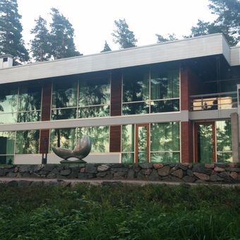 Le Musée d'Art Didrichsen épouse les contours naturels du terrain par son architecture moderniste, avec de grandes fenêtres reliant espaces intérieurs et extérieurs.