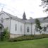 La structure en bois blanc présente des éléments architecturaux nordiques traditionnels avec un clocher qui surplombe l'entrée principale du bâtiment.