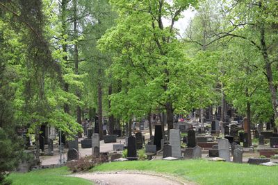 Le lieu de sépulture présente de nombreuses pierres tombales et monuments qui reflètent différentes périodes des traditions funéraires et styles architecturaux finlandais.