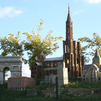 Le parc présente 117 monuments français construits à l'échelle 1:30, répartis sur 5 hectares de terrain paysager avec des collines.