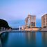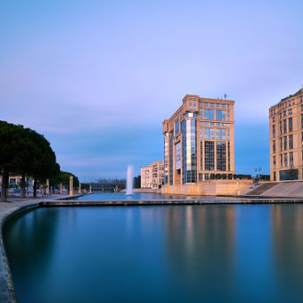 Le quartier Antigone de 36 hectares s'étend du centre historique jusqu'au Lez, avec des bâtiments monumentaux aux éléments classiques agrandis.