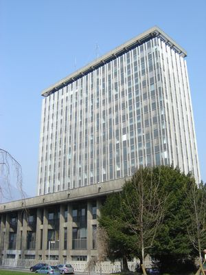 Le bâtiment municipal de 15 étages présente un large socle avec services publics et une tour vitrée conçue par le cabinet Maurice Novarina.
