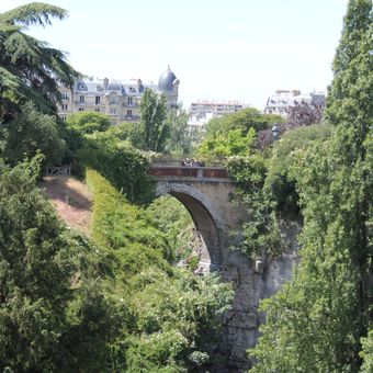 Le Pont des Suicidés s'élève à 22 mètres au-dessus du lac des Buttes-Chaumont, reliant la rive sud à l'île du Belvédère.