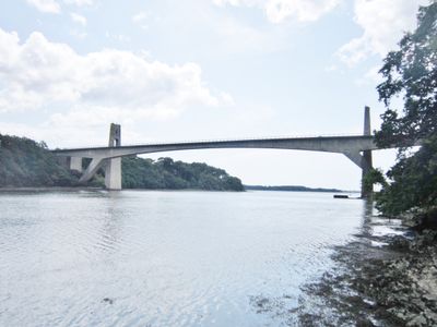 Le Pont du Bonhomme s'étend sur 237 mètres au-dessus de la rivière Blavet, reliant les villes de Kervignac et Lanester avec une portée centrale de 163 mètres.