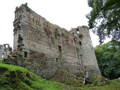 Les vestiges du château de Coatfrec se dressent sur la rive gauche du Léguer, présentant une tour d'angle au sud et des restes du logis-porche.