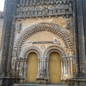 Le portail nord de l'église arbore des sculptures médiévales détaillées représentant des figures humaines, des motifs végétaux et des créatures fantastiques.