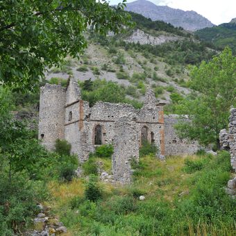Le Château de Lesdiguières est une ruine de château dans les Alpes françaises, positionnée sur un versant et marquée par des murs de pierre. Le site comprend plusieurs sections de bâtiments, notamment les restes d'une chapelle qui s'inscrit dans le paysage des ruines.