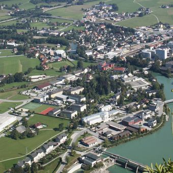Hallein est une ville dans la région de Salzbourg qui s'étend le long de la Salzach dans une vallée montagneuse. L'agglomération se compose de plusieurs quartiers avec des bâtiments traditionnels et un mélange de zones industrielles et de quartiers résidentiels organisés autour des berges du fleuve.