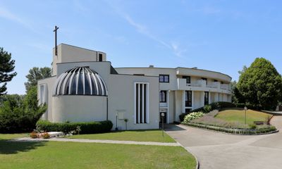 L'abbaye occupe une structure moderne aux murs extérieurs blancs, intégrant des éléments architecturaux monastiques traditionnels et entourée de jardins cultivés.