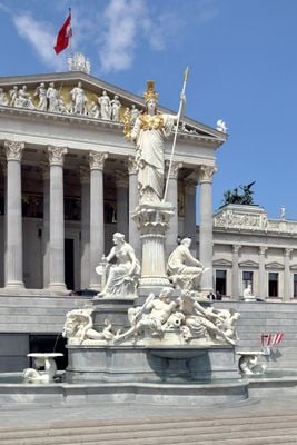La statue en marbre d'Athéna mesure 5.5 mètres de hauteur et se dresse comme élément central entre le Parlement et le boulevard Ringstrasse.