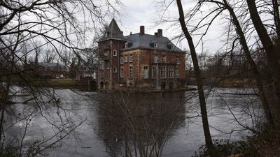 Le château de Bueren présente une architecture Renaissance avec une façade d'entrée dotée d'un pont en arc menant à une cour intérieure.
