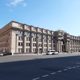 La Poste Centrale présente une façade symétrique en pierre avec de grandes colonnes, de hautes fenêtres et des éléments décoratifs soviétiques.