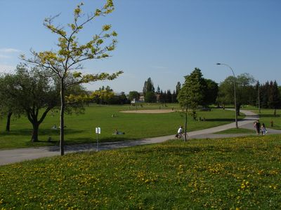 L'espace vert de 36 hectares comprend un lac artificiel, de nombreux terrains de sport, des courts de tennis et un vaste réseau de chemins.