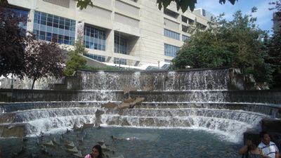 La sculpture Salmon Run au sud du parc présente des poissons métalliques sautant à travers une fontaine d'eau.