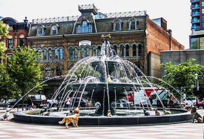 Une fontaine à deux niveaux présente 27 statues de chiens en fonte et deux sculptures de chats, avec de l'eau jaillissant vers un os au sommet.