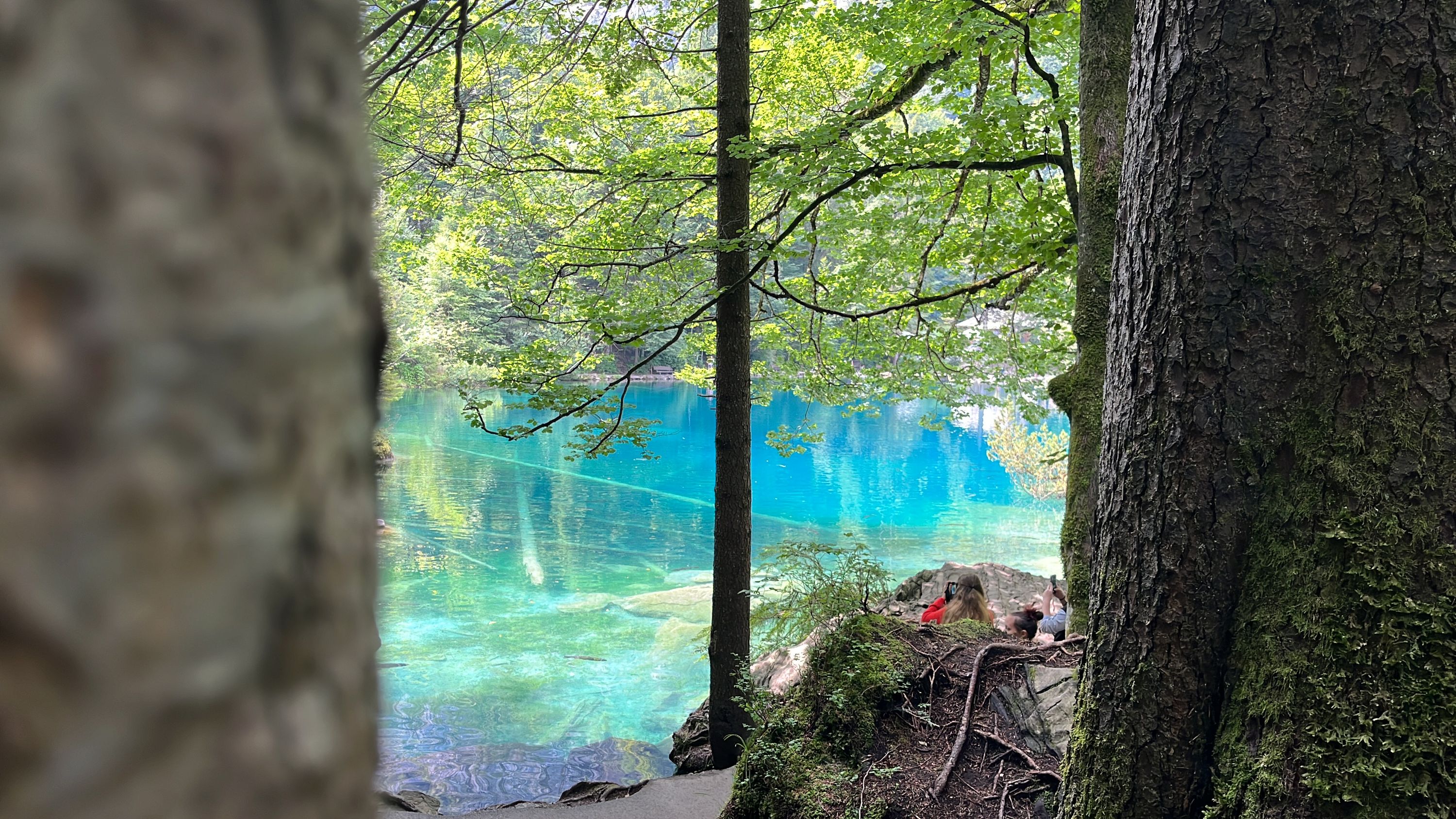 Le lac Blausee présente des eaux turquoise dans un parc naturel de 20 hectares, entouré de sentiers forestiers à 887 mètres dans les Alpes bernoises.