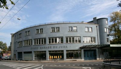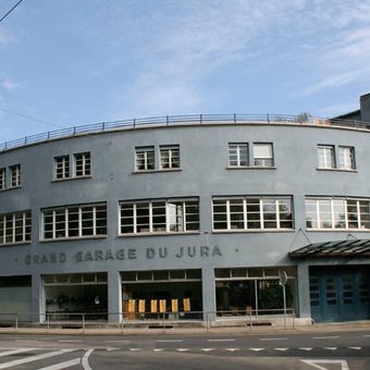 Le Grand Garage du Jura présente une façade courbe avec une tour d'escalier semi-circulaire et de grandes fenêtres réparties sur plusieurs étages.