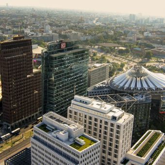 La Place Potsdamer présente des tours de verre, des centres commerciaux et des espaces ouverts formant un complexe urbain dans le quartier Mitte.